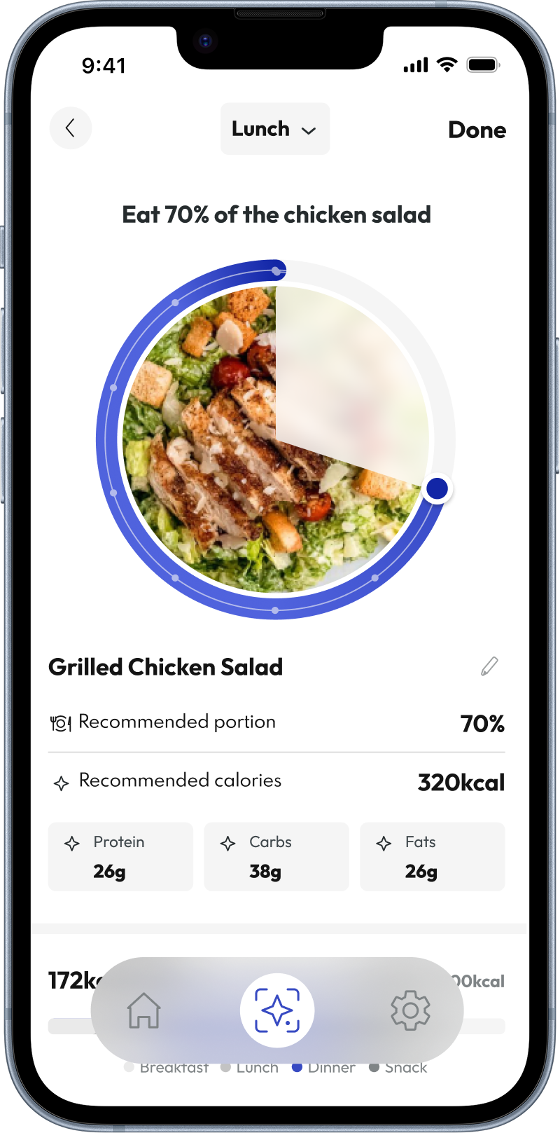 It is a general wellness app that helps people make lower-friction portion decisions before the meal starts.